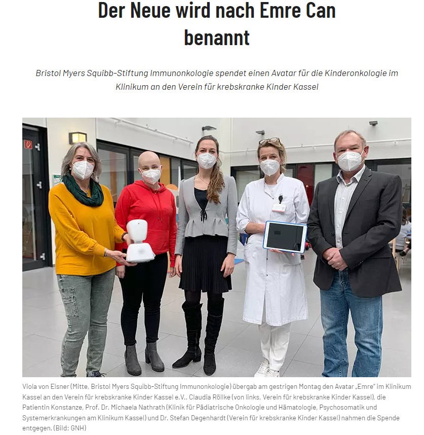 Ein Avatar ist ein kleiner Roboter, der anstelle des Patienten die Schule besucht und so die Teilnahme am Unterricht ermöglicht. Er kann per Computer von dem erkrankten Kind zu Hause gesteuert werden, so dass die Interaktion im Klassenverband möglich ist. Ein Teil des sozialen Umfelds kann so während längerer Therapiezeiten weitgehend erhalten bleiben.